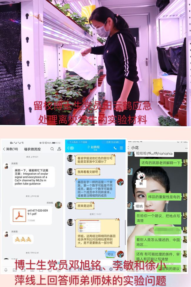 在新冠肺炎疫情期间,全省党建工作样板支部、园艺学院研究生博士党支部,快速响应,构建“支部-党员-实验室-学生”四级联动制度,23名博士在11个实验室、研究所作表率,号召实验室312名研究生坚守“未经审批不得提前返校”、“停教不停学”的要求,齐心协力共同打赢疫情防控阻击战。