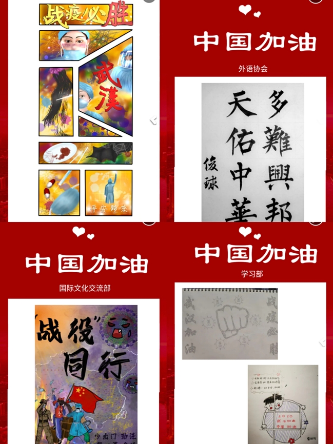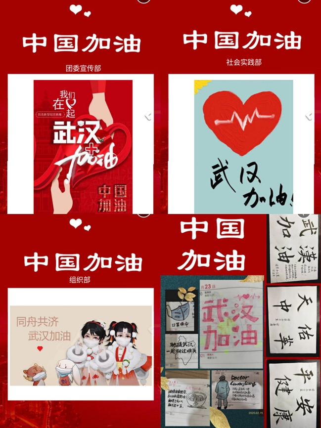 青山一道同云雨,明月何曾是两乡。疫情当下,隔离病毒不隔离关爱。日前,国际学院团委组织青年学子创作祝福作品,为武汉加油,为中国加油。青年学子们积极参与,精心设计,制作出数十份手绘海报、书法等作品,传递对武汉人民、对全体国人的深切祝福,献上对一线抗疫工作者的崇高敬意,汇聚众志成城、共克时艰的坚定信念。