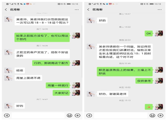 由我校吴良泉副教授团队成员组成的“平和琯溪蜜柚科技小院”师生充分利用信息化工具和手段为平和县柚农提供在线咨询服务与技术指导。一是通过一对一答疑解惑,在线细心指导平和县柚农开展春季施肥管理。根据不同农户不同土壤肥力特点,如何匹配肥料品种、施肥量、施肥位置以及施肥方式等方面进行详细答疑解惑,已在线指导平和县坂仔镇林新民、山格镇吴建和、文峰镇徐文水等众多蜜柚种植大户开展春季施肥管理工作。二是传播绿色高效种植技术、免费提供专业咨询服务。利用微信公众号、微信聊天、短视频等信息传递渠道传播普及绿色高效施肥及植保等技术和相关知识,向求教生产问题的柚农们提供专业咨询服务,帮助农户们解决当前蜜柚种植管理上遇到的问题;通过远程指导柚农开展示范基地施肥工作,提升柚农科学高效施肥本领。此外,吴良泉副教授团队还通过微信聊天、电话沟通等方式了解目前平和蜜柚产区农药化肥等农资产品的储备以及供应情况,在当前防疫情的特殊时期,为农资企业和柚农提供满足蜜柚生长发育需求的可替代农资方案;运用相关的研究成果和科技知识为企业和科普推广站提供技术材料,为其开展在线科普培训活动提供技术支撑。
