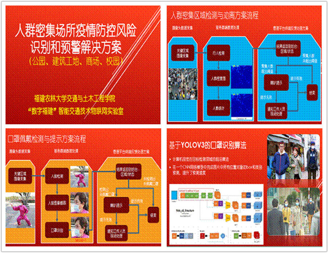 我校数字福建智能交通技术物联网实验室廖飞宇教授团队充分利用团队在结构在线监测和人工智能方面的科研力量,打造了以自动化实时监测为特征,集现代传感、通信网络和计算机技术为一体的结构综合监测系统,并应用于金鸡山公园栈道及飞虹桥等结构安全监测,实现了全自动数据采集和预警,现场无人化监管,有效的避免了作业人员聚集的风险,并极大提高了工作效率,助力公园管理部门做好疫情防控期间的基础设施安全监测工作,也为公园重新开放做好准备。团队还与福建省福泉高速公路有限公司、福建省高速技术咨询有限公司等单位积极合作,探索高速公路ETC门式刚架的在线监测和快速维护解决方案,力求疫情期间在保障ETC门架结构安全的同时尽量减少现场人工检测作业,有效避免人员交叉感染现象。针对当前疫情复杂的形势,各地陆续迎来复工大潮,公共场所相继开放,可能存在人群密集的防疫风险,团队加紧研发针对公园、建筑工地、商场、学校等场景的疫情风险识别与预警解决方案,利用机器视觉技术对人群聚集区域和人员未佩戴口罩等风险进行自动识别和联动预警。该技术已和福建省建筑科学研究院合作进行建筑工地场景测试。
