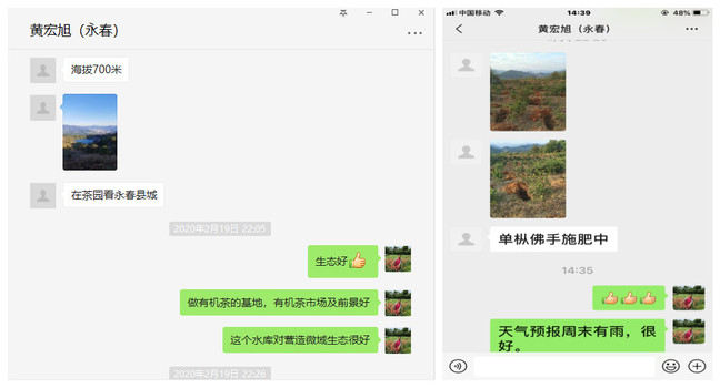 如何做好春茶前的茶园管理,关系春茶的产量和品质,是茶区茶企关注的一个重要问题。永春山门茶业总经理黄宏旭电话告诉支部书记郭玉琼老师,此次疫情更坚定了他做有机茶、健康茶的信念,并就当前茶园建设与管理进行了咨询。郭玉琼老师根据佛手茶萌芽期迟的特性,以及公司茶园的种植和管理特点,建议他可在2月下旬到3月上旬进行挖穴施肥,充分利用当地的农家肥等有机肥源,同时由于2019年全省总体比较干旱,目前雨水也不多的气候特点,让他多关注天气预报,保证茶树有效吸收肥力,达到春茶稳产提质效果。目前基地已着手进行挖穴施肥管理工作,并时时发送微信图片和视频进行咨询与交流。