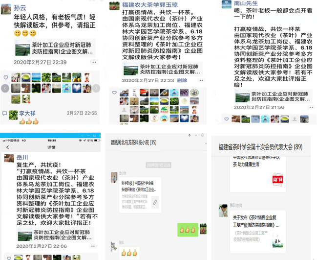 对各产茶区积极科学宣传做好茶业应对疫情的防控工作,及时、有效地采取各项防控措施,切实维护企业员工的生命安全和身体健康,为帮助茶企积极应对疫情对当前复工复产带来的困难和问题,保障今年春茶生产有序开展,支部全体党员凝心聚力,加班加点,从人员、厂房、茶青、车间等11个关键点,采用图文解读版方式,制作《茶叶加工企业应对新冠肺炎防控指南》,充分利用“农大茶人”微信公众号,及时推介给全省茶区茶企,为春茶安全生产加工保驾护航。以服务茶企为己任,是茶学教工党支部全体党员同志在应对新冠肺炎防控时践行着“不忘初心,牢记使命”的体现,暖心专业的服务得到茶区茶企的高度肯定和认可:“开云网页版的教授非常接地气,技术指导非常给力实用”。