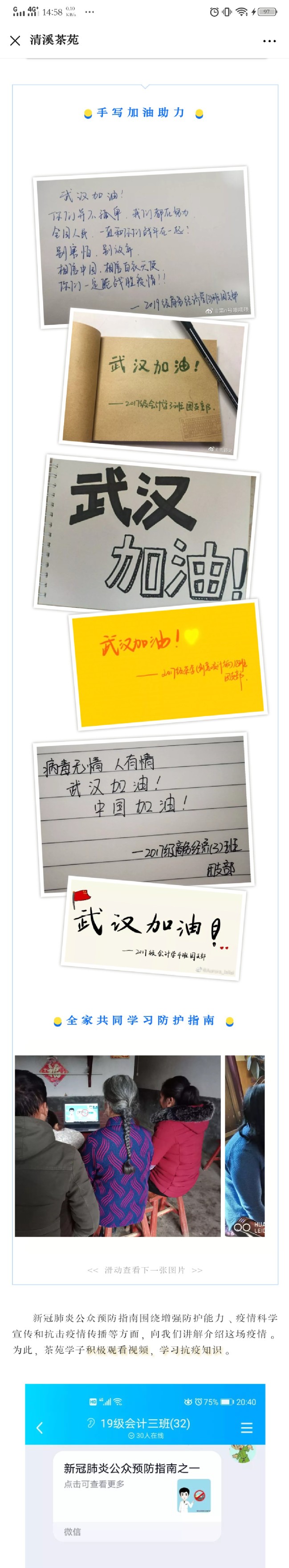 通过线上关于新型冠状病毒感染的肺炎的扫盲学习,目标是扫除学生对于新型冠状病毒感染的肺炎的盲区、误区。学院全体学生通过班级群、学院微信公众号等网络平台的推送来学习新型冠肺炎预防指南,进一步加深了对新冠肺炎的认识与了解,增强自身防护能力。学院鼓励学生积极参与新型冠状病毒感染的肺炎防控线上知识问答并评选出防疫十佳小能手。除此之外,各团支部还组织了手写祝福语活动,为中国、武汉以及抗击在疫情一线的所有工作人员加油。