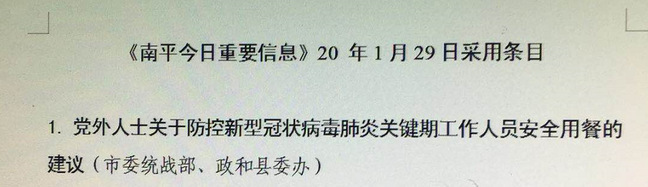 一线抗疫情。从大年初二到现在,杨志坚老师一直在政和县外屯乡开展抗击疫情工作,进村入户开展宣传工作,疏散人员聚集,到劝导点带班值勤,驻村和部署挂点村防控疫情工作,管控该村从武汉、温州、庆元等地回来过年的村民;针对基层工作实际,撰写了《关于防控新型冠状病毒肺炎关键期工作人员安全用餐的建议》,所写建议被政和县委办、南平市统战部、南平市委办采用,应用于防控措施的制定优化;带头实施分餐,有效降低了疫情风险。