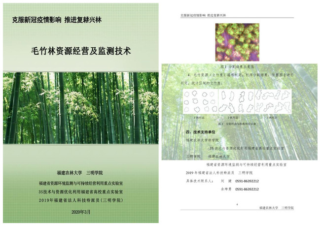 实验室还依托团队承担中央财政林业科技推广项目、国家重点研发、福建省高校产学项目及前期研究成果与基础,联合福建省法人科技特派员三明学院,针对福建省毛竹经营状况和疫情期对毛竹资源经营所可能造成的影响,编制《毛竹林资源优化经营及资源监测技术要点》手册,发放于福建省永安市、顺昌县等林业生产单位和林农手中,扶助林农克服新冠肺炎疫情影响,推进复耕兴林。