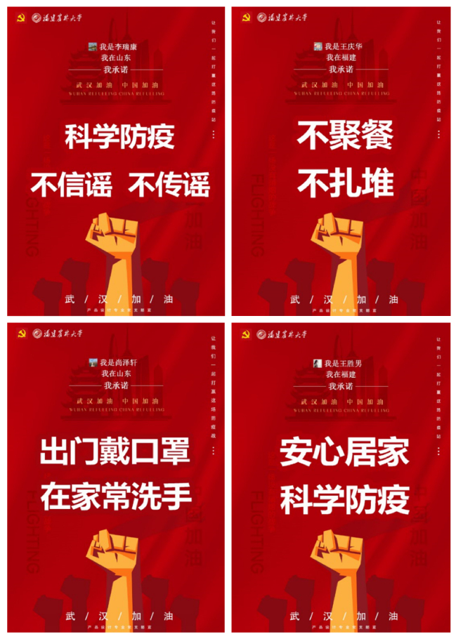 接力转发“党员承诺”,众志成城共抗疫情。莫说“宅”在家中无可为,不谈远隔千里莫能助。产品设计专业党支部中来自福建、山东、河北等地的同学们在家中制作抗疫海报,作出“不聚会,拒野味”、“强防护,不惶恐,信科学,不传谣”等庄严承诺。支部的每个成员凝聚一心,纷纷在朋友圈转发海报,承诺对抗击疫情的决心,并主动为身边的亲属好友科普防疫知识,在凝聚支部力量的同时增强打赢这场防疫阻击战的信心。