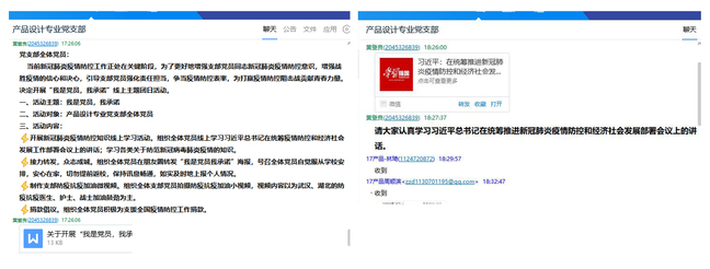 以支部Q群为平台,加强线上理论学习。产品设计专业党支部利用QQ群平台,组织全体学生党员学习习近平总书记关于防疫抗疫的重要讲话精神。每天定时向支部群里转发有关新型冠状病毒的防治知识和实况播报,帮助支部党员提高防疫意识、增长防疫知识,积极引导学生党员在防控疫情战斗中展现共产党员的先进性,不信谣、不传谣。面对疫情,学生党员主动改变学习习惯,积极适应在线学习方式,认真开展线上自主学习,积极参与到学习讨论中,取得了良好的学习效果。在这场亦是大规模的学习保卫战中,学生党员们从未降低对学习的要求,自觉用理论知识武装自己。