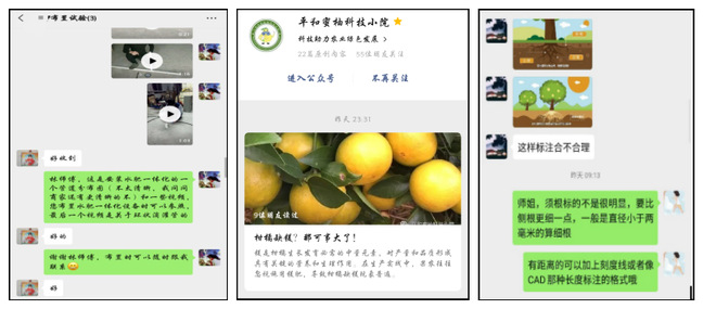 学院国际镁研究所2018级资源利用与植物保护专业研究生黄晓曼主动联系平和柚农,精准收集柚农科技需求,录制蜜柚春季施肥和除草管理的相关视频,通过网络在线平台,为平和县的柚农的蜜柚种植管理提供技术指导;利用微信公众号、微信聊天、短视频等信息传递渠道传播普及绿色高效施肥及植保等技术和相关知识,向求教生产问题的柚农们提供专业咨询服务,帮助农户们解决当前蜜柚种植管理上遇到的问题。2019级资源利用与植物保护研究生刘有通过父母带动周边农户收看苹果、柑橘专家的果园管理直播,并积极与农户讨论果园施肥问题,提高当地农户果园管理水平。针对当地农户对果园施肥次数和施肥方式的疑惑,刘有根据在学校积累的丰富实践经验,为农户讲解科学施肥和管理的重要性,并提出有针对性建议;针对农户直接将家畜粪便堆在树干周围的现象,指导农户通过将畜禽粪便捣碎后浅翻的处理手段入田,提高施肥效率。