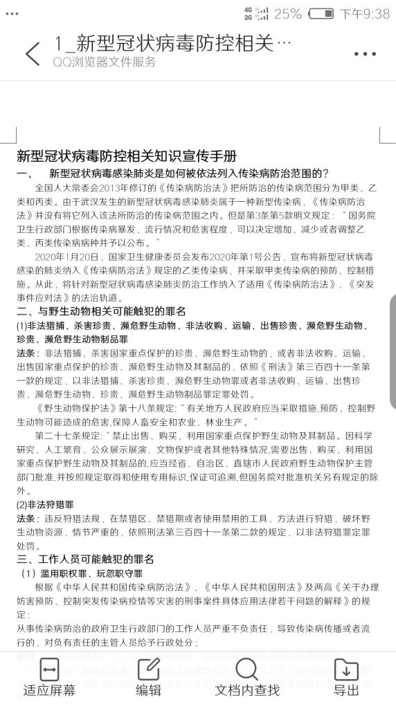 编纂一份防疫普法宣传手册。为引导全院学生深入了解疫情防控工作有关法律知识,促进疫情防控工作依法有序开展,学院汇总整理了当前疫情防控工作有关的法律规定,以图文并茂的方式编纂了《新型冠状病毒防控相关知识宣传手册》。重点围绕传染病防治法、野生动物保护法、突发事件应对法、突发公共卫生事件应急条例等法律法规,以及教育部疫情防控相关规定及集体宿舍如何做好防范等,线上发放给全院1337名学生和学院教师学习,引导师生明确自己在疫情防控中的权利义务,增强师生依法防控的思想自觉和行动自觉。