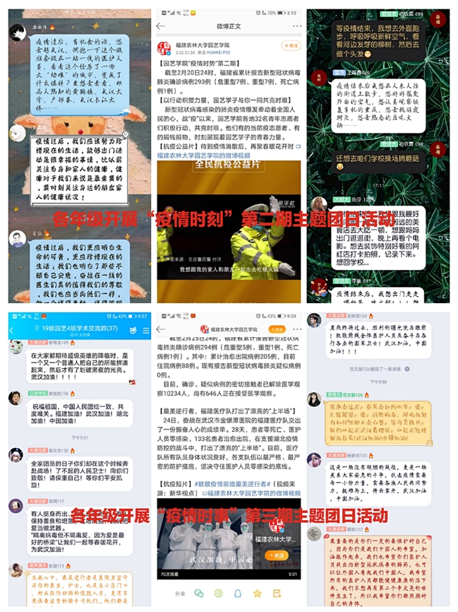 同学们开展了充满正能量的线上讨论,纷纷表示作为“90后”新生代力量,要热爱自己的祖国,要担当中国青年的历史使命与时代责任。2019级设施专业王天彩同学分享到:“我国之所以办成了许多国家办不了的大事,一个重要原因就在于中国特色社会主义制度具有‘坚持全国一盘棋,调动各方面积极性,集中力量办大事’的显著优势”。2018级园艺专业刘燕飞同学表示,“英勇无畏和乐观坚强是中华民族的精神硬核,守望相助、家国情怀是中华民族的文化基因。”在这场战役中,她深切体会到文化自信的力量。2017级园艺专业王宇航同学积极参与抗击疫情志愿服务,她表示:“祖国如有难,汝应作先锋,用实际行动支援抗疫一线,为疫情防控贡献青春力量体现了新时代大学生的责任和担当”。2018级花卉与景观园艺硕士研究生邱子文利用自身专业知识,助力家乡脐橙扶贫产业安全生产,他说:“尽最大努力保证复工复产顺利进行,这是党赋予我们青年党员的职责使命”。2019级辅导员徐志杰说:“作为思政辅导员,要把立德树人牢记心间,充分运用好疫情防控阻击战中鲜活的思政教育实践教材,引导同学们更好的感悟家国情怀,号召大家积极行动起来,共同抗击疫情,做一名有担当的大学生。”