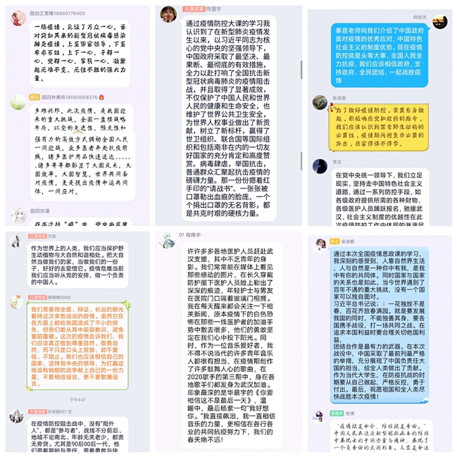疫情防控思政课将时事热点与理论原理深度结合,深深激活了学生参与学习讨论的热情,从党中央、国务院关于做好疫情防控工作的有力措施和深切关怀,同学们感受到了党和政府以人民为中心的初心不改;从钟南山、李兰娟、张文宏等白衣战士明知危险依旧逆行一线的选择,同学们明白了“苟利国家生死以,岂因祸福避趋之”的中国精神;从火神山、雷神山、方舱医院的建设,到核酸检测、疫苗研发等工作的加速推进,同学们明白了什么叫中国速度;从全国坚持共进退,团结力量办大事,到全国打响“把人民群众生命健康放在第一位”的疫情防控总体战、阻击战,同学们深刻认识到了党领导下我国集中力量办大事的制度优势。