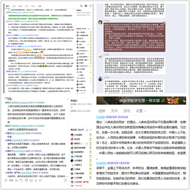 根据教育部统一部署,3月9日下午,国际学院全院在籍中国学生和政工干部全程收看由教育部社科司与人民网联合开展的“全国大学生同上一堂疫情防控思政大课”直播,并借助学生党支部、学生骨干、各班级QQ群等交流平台实时进行线上讨论,分享学习心得,深化思想认识。
