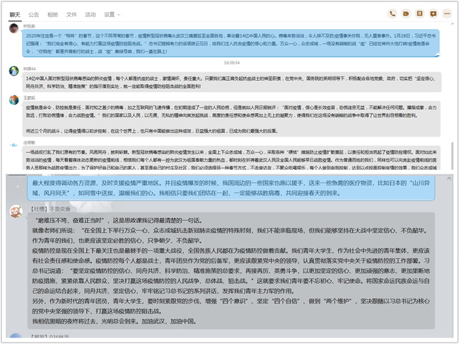 课上,学院同学还纷纷对课程内容进行讨论,并在课后撰写了相关心得体会。2016级公管事业管理专业游菲芳表示,在疫情期间,伴随着接受信息途径的多样化,所接受的信息越来越冗杂。而本次的全国大学生同上一堂课疫情防控思政大课,使她能够更加准确、客观、系统地认识本次疫情防控的情况。她认为作为一名大学生,要辨是非、不信谣、不传谣,同时坚定信心、做好自我,尽自己所能,为国家打好疫情防控攻击战奉献自己的力量。