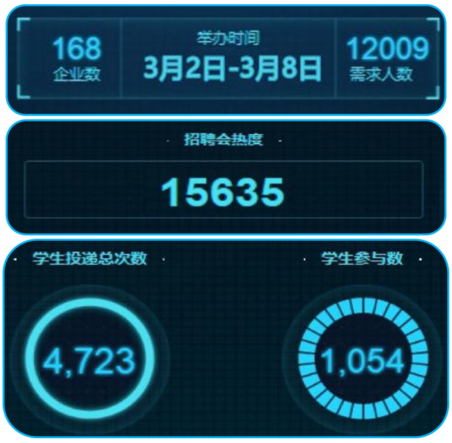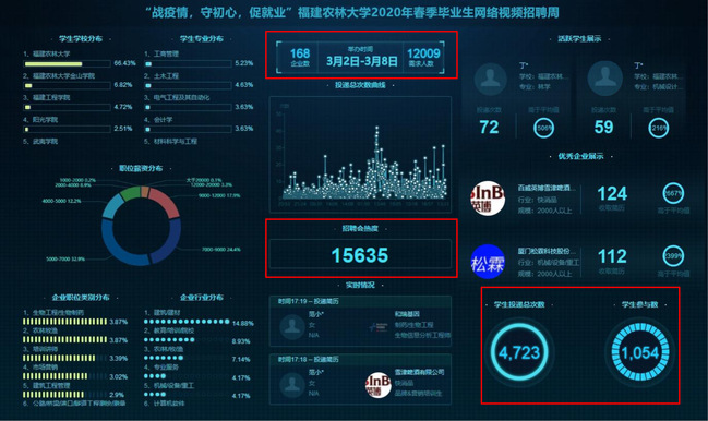 本场招聘周活动于3月2日-8日通过线上网络平台开展,共吸引了包括海尔智家股份有限公司、京东方科技集团股份有限公司、福建永辉超市有限公司、温氏食品集团股份有限公司、正邦集团有限公司、浙江交工集团股份有限公司、福建圣农发展股份有限公司、百威英博雪津啤酒有限公司、中建路桥集团有限公司、通达(厦门)科技有限公司、双胞胎(集团)股份有限公司、中国一冶集团有限公司、厦门松霖科技股份有限公司、浙江我武生物科技股份有限公司、大连毅都集团有限公司、福建火炬电子科技股份有限公司、茶花现代家居用品股份有限公司、福州朴朴电子商务有限公司等知名公司在内的168家用人单位参会,为毕业生提供了12000多个就业岗位,涵盖了农林牧渔业、制造业、建筑业、教育、批发和零售业、金融业、房地产业、住宿和餐饮业、信息传输、软件和信息技术服务业、交通运输仓储和邮政业、水利环境和公共设施管理业、科学研究和技术服务业、居民服务、文化体育和娱乐业等各个行业领域。据平台统计,本场网络视频招聘周活动的毕业生访问量为15000多人次,投递简历4700余份,1000多名毕业生通过平台进行了视频面试。