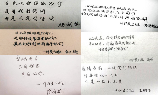 各团支部开展形式多样的“众志成城,抗击疫情”线上团日活动。有的采用居家录制防“疫”宣传小短片、手写加油标语接力等方式为武汉加油;有的举办“万众一心,书信传情——给逆行者的三行情书”活动,用短短的三行情书,致敬战斗在一线的逆行者们;有的开展“展厨艺献孝心,同心抗疫情”线上活动,为家人献上一道道爱心满满的菜肴。