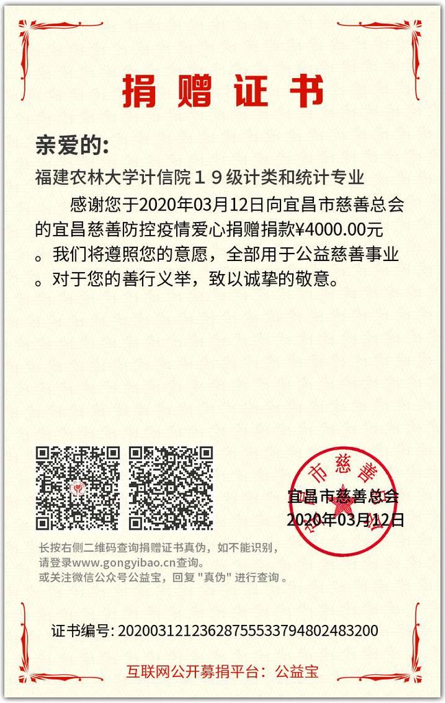 2019级统计学和计算机类的8个班级团支部联合发起“爱心汇聚,共克时艰”募捐倡议,呼吁各支部团员为战胜疫情贡献自己的力量。同学们踊跃捐款,截至3月12日,共筹集款目4000元整。筹集的善款以“开云网页版计信院19级计类和统计专业”的名义,捐赠给湖北省慈善总会“新型冠状病毒感染的肺炎疫情防控专项募捐”项目,充分体现了计信人的使命与担当。