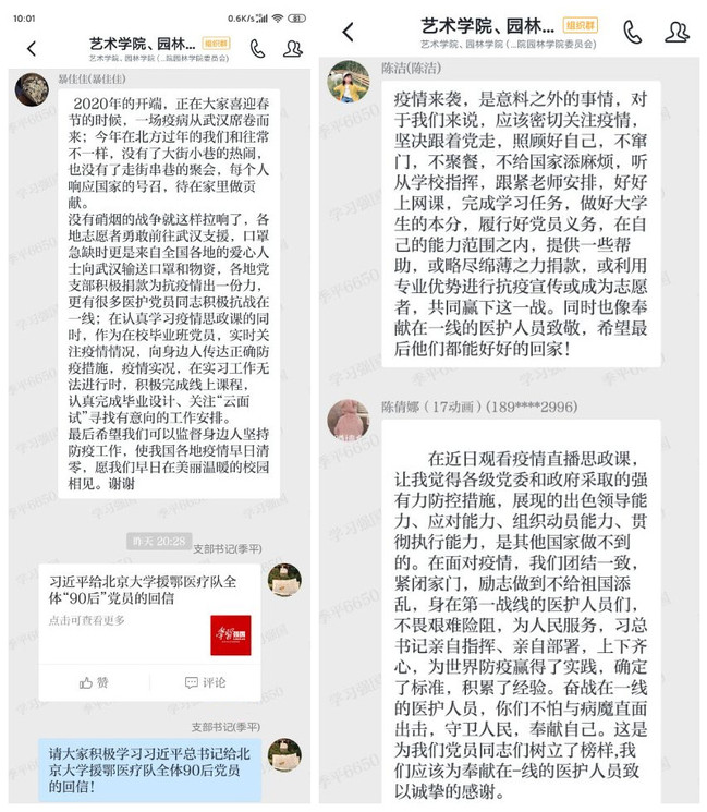 支部党员还认真学习了习近平总书记给北京大学援鄂医疗全体“90后”党员的回信精神。大家备受鼓舞,纷纷表示北京大学援鄂医疗全体“90后”党员是我们的学习榜样,我们要传承好这种精神,做好自己的本职,用青春书写许国担当,我们相信,在以习近平同志为核心的党中央坚强领导下,必将取得这场疫情防控阻击战的胜利!