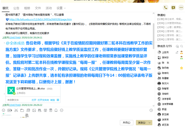 为了方便工作传达和经验交流,学院组建了在线课程任课教师群,及时发布开展线上教学的各项通知、线上教学培训资源及数字教材资源,及时解决任课教师提出的问题,以提高线上教学质量。