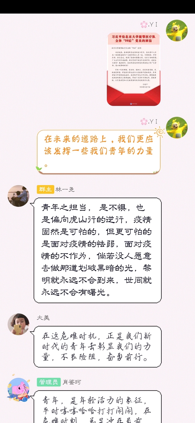 参与到抗疫志愿者工作的2017级农学专业中共预备党员陈子恒谈到:“通过学习习近平总书记的回信,我更加明确肩上的担当与责任,坚定了打赢这场疫情攻坚战的决心和信心。当疫情爆发时,我通过新闻动态了解到此次疫情的严峻,看着全国医护人员负重逆行,我意识到应该发挥党员作用,积极报名参加乡镇防疫志愿者,为防疫工作奉献自己一份小小的力量。习总书记回信中指出,青年一代有理想、有本领、有担当,国家就有前途,民族就有希望。习总书记的教诲如同指路明灯,照亮了我们的道路,在未来的日子,我会努力学习专业知识,为国家未来的事业发展自己的力量。”