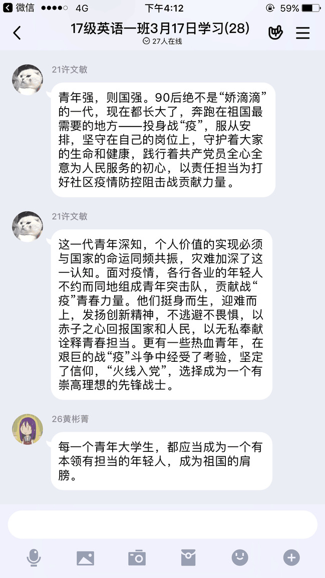 2017级英语专业李嘉慧和吴晓玲同学表示作为广大青年的一分子,虽不能像青年医护人员一样投身到一线中,日夜拼搏奋战,但是参与了每天为留校的来华留学生提供关于疫情重要新闻的志愿工作。她们坚信,涓涓细流将汇成大海,青年人齐心勠力,定能共克时艰!