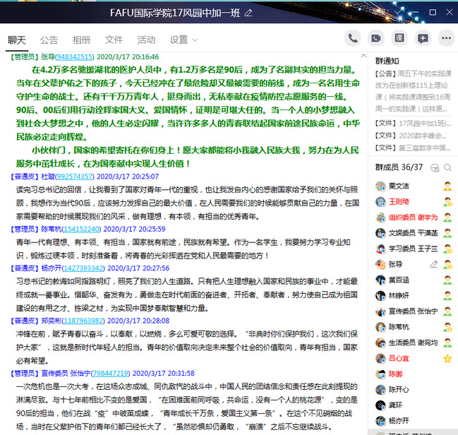 近日,国际学院迅速组织师生通过QQ群、微信等方式学习习近平总书记给北大援鄂医疗队全体“90后”党员的回信。习近平总书记的回信谆谆嘱托,激励着广大青年勇挑重担,为打赢疫情防控阻击战贡献力量,让青春在党和人民最需要的地方绽放绚丽之花。