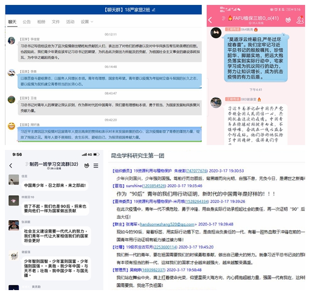“总书记的回信,是对无数默默奉献的优秀青年党员的肯定与嘱托。”昆虫学科研究生第三党支部书记、2018级农业昆虫与害虫防治硕士生鲁盛平,是一名 “90后”湖北籍学生,他表示:“看到总书记给北京大学援鄂医疗队全体“90后”党员的回信后,我的内心也受到了极大的鼓舞!作为一名学生党支部书记,一方面要积极响应落实学校、学院疫情防控的要求,带领党支部做好疫情防控各项工作;另一方面,我在湖北黄梅老家积极响应当地党委的号召成为一名志愿者,在家乡疫情防控工作中贡献自己的力量!用自己的行动去践行一名共产党员、一名新时代中国青年的责任与担当!”