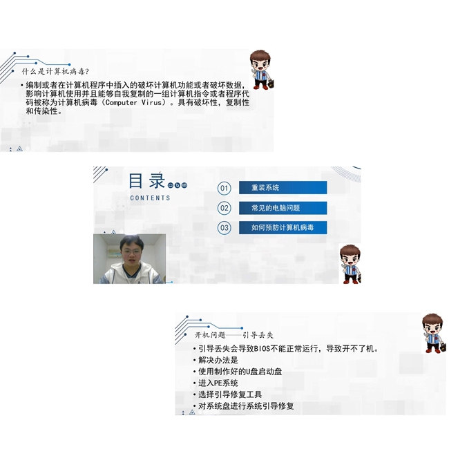 疫情无情人有情,志愿服务不断线。3月15日,由“e修哥”志愿服务团党支部牵头,与软件工程教师党支部结对共建,党支部成员通过直播授课的形式为疫情期间居家学习的同学们带来一堂耳目一新的计算机病毒及防护教程课程。