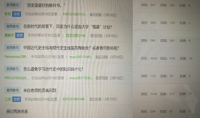 18食科专业的周禹慧同学表示:“在疫情期间,虽然不能去学校,但我们可以通过电子设备进行线上学习。通过平台,近代史纲要教学既方便又灵活快捷,我们可以反复观看下载讲课录像、课件等授课内容,可以针对重点难点高效复习,加深理解;同时我们也可以随时在网络教学平台上与老师交流,交流的结果大家也可以一起看到,提高了教学方面的效率,线上小测发布出分都很快捷,有利于教师更好掌握学生的对知识点的理解情况,在网络教学活动中建立起一个有效的交流环境,能够使得分布在不同地方的师生方便的交流,从而能够有效的提高教学活动的质量。”