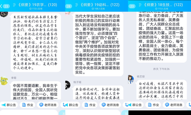老师们也认为,这种在线教学是一次考验,但也是一次机会。在这次线上教学中,老师们积极发挥网络平台的优势,对学生进行一对一、一对多的远程指导,在确保教学工作顺利进行的同时,也保证了教学工作的优质完成,使思政课充分发挥教书育人的功能,同时也为探索线上线下混合教学模式积累了很好的经验。