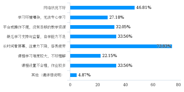 调查显示,学生认为线上教学的不足主要集中在长时间看屏幕易疲劳引起注意力下降、网络状况不稳定、学习监督不够等问题。