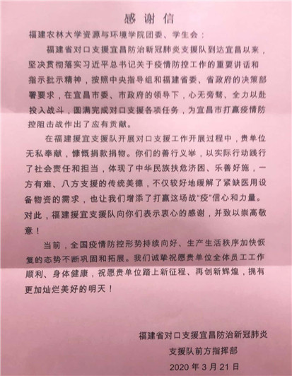 据悉,2月14日,资环学院团委、学生会积极响应省委、省政府对口支援湖北宜昌市决策部署,向全院学生发起向宜昌定向捐助的倡议,仅用两天时间为宜昌市疫情防控捐款2万余元。当前,疫情防控进入新的阶段,全国疫情防控形势持续向好、生产生活秩序加快恢复的态势不断巩固和拓展,但还不能“轻言胜利”、“高枕无忧”,资源与环境学院团委、学生会将继续深入学习贯彻习近平总书记关于疫情防控工作的重要讲话精神和一系列重要指示精神,引领团学青年增强“四个意识”,坚定“四个自信”,坚决做到“两个维护”,以实际行动践行听党话、跟党走的初心使命,在这场疫情防控阻击战中发挥青春力量。