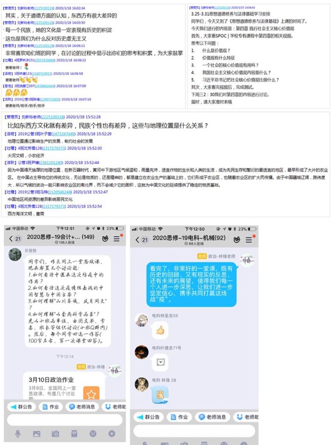 本学期思修教研室开设本科生课程39个班次,学生人数达到2127人。为确保量大面广的思政课在线教学的教育效率、探索有效的网络教学“师生互动”,教研室综合运用中国大学MOOC资源以及腾讯课堂等开展直播教学、线上讨论,并将防疫抗疫工作中涌现的先进人物、典型事迹作为教学案例,如“硬核榜样”钟南山、勇敢“逆行”的90后医务人员、“中国速度”建成的火神山和雷神山医院、人民子弟兵“誓死不退”的快速驰援等等。通过讲好中国抗击疫情故事,促进广大学子深刻体悟中国人民团结一心、同舟共济、众志成城抗疫情的强大力量,引导学生思考自我价值与社会价值的关系,思考青春、生命、敬畏、担当、感恩,厚植爱国情怀,增加学生的参与意识与学习主动性,积极打造传播正能量的思想空间。