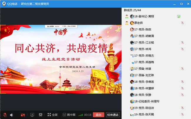 会上,支部全体党员一同观看了科学抗疫视频节目,对新型冠状病毒的传播途径和防范方法有了更为深刻的了解,进一步提高了防疫意识。围绕近期全国抗疫情况,同志们在视频会议上积极展开讨论,纷纷发表自己的看法和感想。游卿翔、陈思杨、林雄等同志表示,通过此次疫情感受到了每一个平凡工作者在抗击疫情中的不平凡,感受到了国家在面对磨难时展现出来的上下一心的强大,感受到了身为青年党员所应肩负起的责任与担当。湖北武汉籍党员黄翔分享了他的亲身经历,对援鄂医务工作者表示由衷的感谢及敬佩,称他们为最美的天使、真正的英雄、新时代最可爱的人。