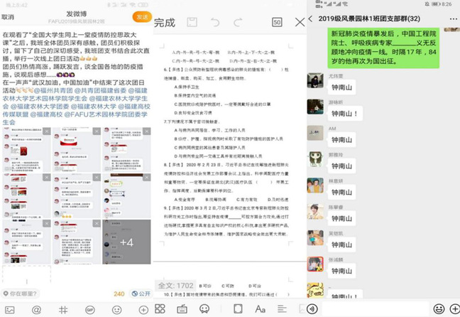 2019级风景园林1班团支部于3月20日开展了“防疫知识竞赛”线上竞赛活动,由团支书提出关于疫情防控的25个问题,同学们积极在线抢答,同时团支书在线共享防疫视频,帮助同学们进一步了解防疫知识。