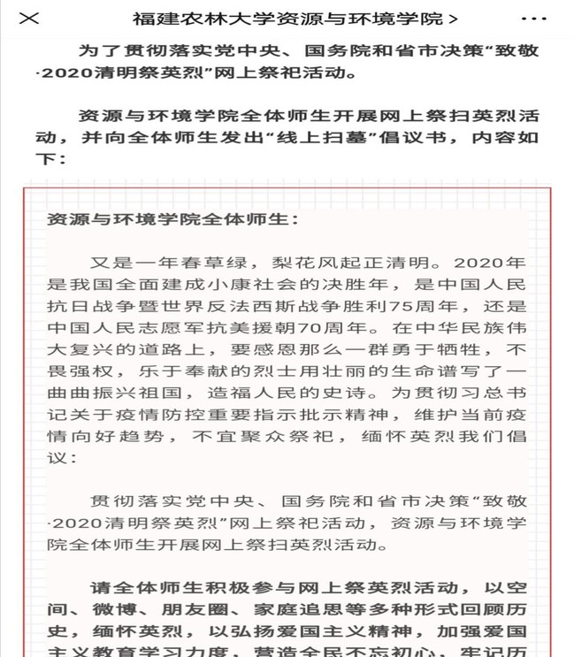 在清明节即将到来之际,缅怀先烈、祭扫英烈是弘扬英烈精神传承红色基因的重要组成部分。为贯彻落实党中央、国务院和省市决策“致敬·2020清明祭英烈”网上祭祀活动部署,在当前全国上下众志成城、坚决打赢疫情防控阻击战的关键时期,资源与环境学院向全体师生发起网上祭扫英烈活动倡议。倡议书建议全院师生积极参与网上祭英烈活动,以空间、微博、朋友圈、家庭追思等多种形式回顾历史,缅怀英烈,以弘扬爱国主义精神,加强爱国主义教育学习力度,营造全民不忘初心,牢记历史的情感氛围。