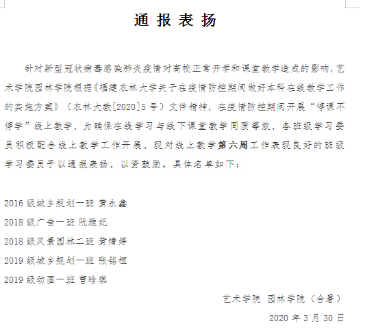 学院通过综合班级学习委员线上学风营造、线上考勤、线上答疑组织、线上困难帮扶等情况,各年级每周评选1-2名“优秀学习委员”,鼓励班级学习委员积极配合线上教学工作;同时,为激励学院学生线上学习的主动性积极性,营造比学赶超的良好的氛围,在第一轮结束的每门线上教学课程中评选3名“优秀学员”。学院2017级园林专业的黄同学表示:“班级学委第一时间建立学习困难帮扶小组,在解决学习难题的同时加深了同学间的友谊和团结,让我们携手成长。”学院2019级陈同学表示:“同学们线上自主开展热烈研讨、提交作业作品,充分发挥了学习主体性,学习氛围浓烈。”