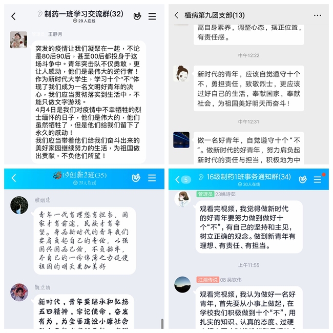 2018级制药工程1班杨颖表示,作为大学生的我们,要脚踏实地,用实际行动践行“十不”,从一点一滴做起,向担起抗击疫情重任的青年们学习,将青年担当与个人发展紧密联系在一起,为祖国的未来贡献一份力量。