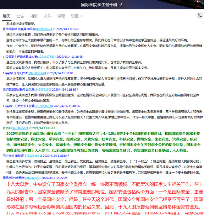 4月14日,由教育部组织开展的“千万学生同上一堂国家安全教育课”活动在中国大学生在线、易班、国家开放大学网站及有关在线教育平台发布。国际学院师生积极响应要求,认真观看学习视频,保质保量做好线上学习和问答通知组织工作,同时开展线上讨论、主题“云”班会等,进行交流互动。