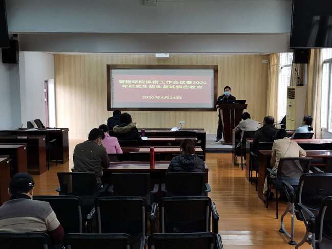 4月24日上午,管理学院召开保密工作会议暨2020年研究生招生复试保密教育,学院党政班子成员、辅导员和全体行政干部参加会议,会议由院党委纪检委员黄怡主持。