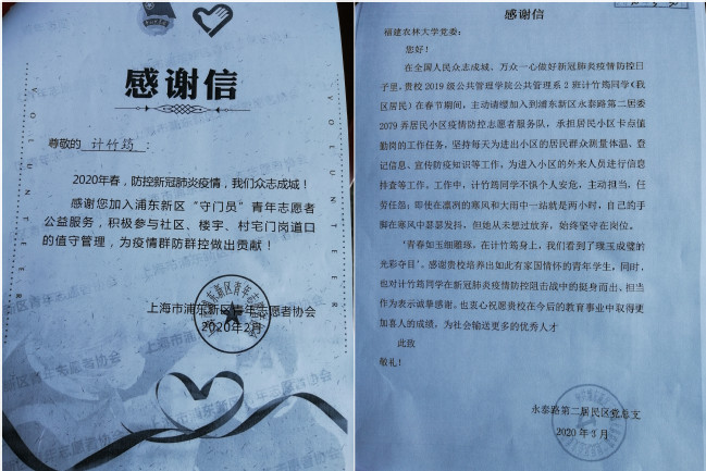 近日,公共管理学院先后收到上海浦东新区永泰路第二居民区党总支、上海市浦东新区青年志愿者协会发来的两封感谢信,对学院2019级公共管理类专业2班计竹筠同学在疫情期间,协助社区开展疫情防控工作的突出表现给予了高度的肯定和诚挚的感谢。