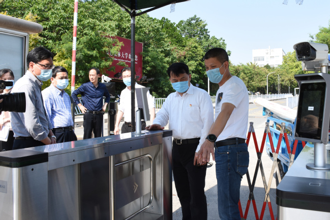 严金静一行先后察看了校西门靠三环路一侧围挡,西二门和东二门门禁系统建设,“学生街”门区建设情况,亲自体验入校人脸识别测温系统,深入了解车辆及人员入校管控措施;在校医院和后勤处,实地查看了口罩、酒精、消毒液等防疫物资储备情况;在南区第九食堂检查了食品卫生安全及引导排队、就餐等各类标识设置情况;在原南区9号危房拆除现场,察看了后期运动场所建设情况。