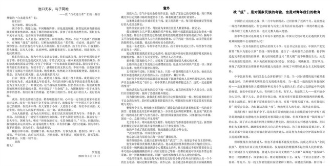 3月10日-3月20日,学院通过开展“以文为援,抗击疫情”征文比赛号召学子们拿起笔,用文字抒发对逆行者们的敬意和自己的理想与责任。本次征文比赛评选出了《窗外》,《岂曰无衣,与子同袍》,《战“疫”,是对国家民族的考验,也是对青年我们的教育》等优秀作品。