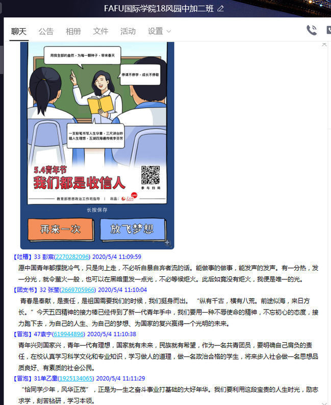 学院党委书记、2019级风景园林中加1班班主任肖红新老师参与所带班级团支部线上学习,他代表学院党委对青年学子致以节日的祝贺和亲切的问候,他表示:以“爱国、进步、民主、科学”的“五四”精神薪火相传,历久弥新,在中华民族历史进程中不断被注入新的时代内涵,应成为我们当代青年人的价值引领;总书记的寄语为我们指明前进方向,希望同学们筑牢家国情怀,将个人梦想与国家民族前途命运联系起来,勤奋求知,锐意进取,开拓创新,躬身实践,为建设创新型国家和现代化强国添砖加瓦。