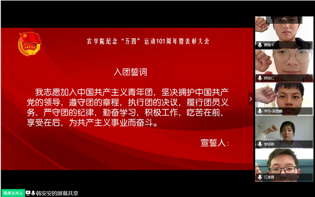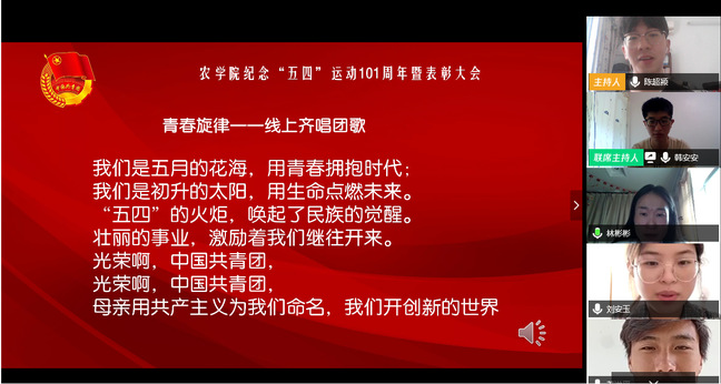 5月3日下午,农学院于线上召开了纪念五四运动101周年暨五四表彰大会。学院团委书记林彬彬、团委学生会主要学生干部、各班团支书、受表彰集体代表和个人等110多人参加会议。会议由学院团总支书记陈超颍主持。