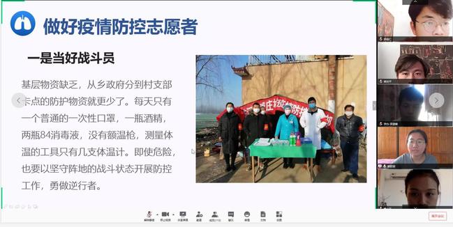 在“青春战役”抗疫志愿先进个人故事分享会中,积极响应村支部号召参加防疫的吕佳情,协助社区工作人员输入人员信息的张文彦,争当宣传员、全方位宣传防疫的姜欧丽,争当战斗员、于一线抗击疫情的邓歆,勇担责任主动参与的曾小玉等五位农学院抗疫志愿者分别分享了他们的抗疫故事。