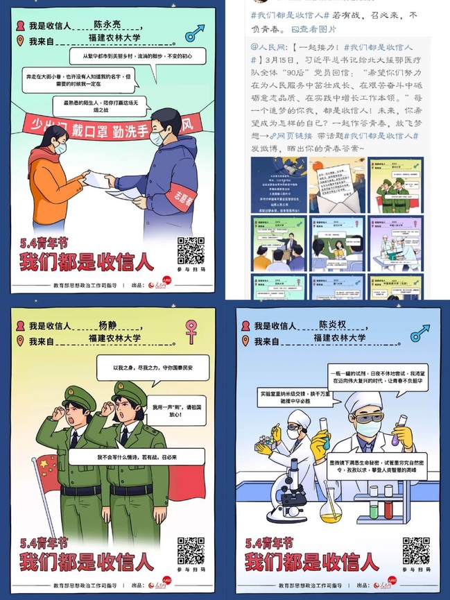 5月4日,教育部思政司在人民网新媒体平台推出“我们都是收信人”主题活动,邀请全国高校千万师生共同参与。食品科学学院积极动员学院学生参与互动,助力主题活动。