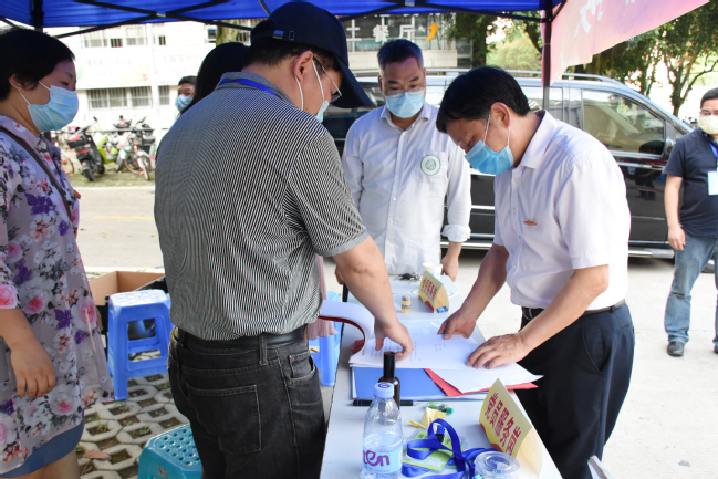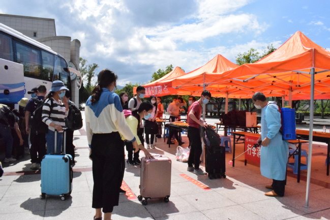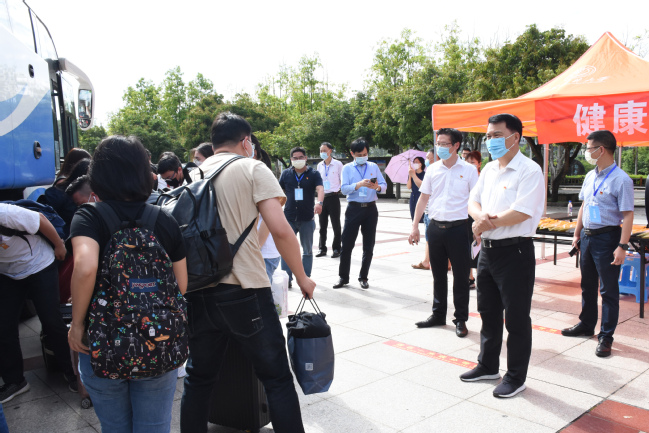 校外接站报到疏导点工作人员迎接学生返校