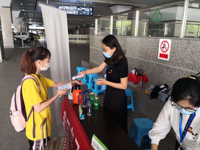 校外接站报到疏导点工作人员检测学生体温