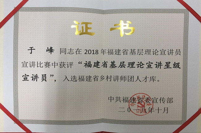 马克思主义学院始终把宣传党的路线、方针、政策作为马克思主义理论学科建设的基本任务之一。近五年来,本院教师围绕习近平新时代中国特色社会主义思想和党的十九大精神,以及十八届三中、四中、五中、六中全会等重要会议精神,不仅在本校各部门广泛进行宣讲,而且深入到厦门、南平、三明、泉州、龙岩等全省各地市,进机关、进企业、进学校、进社区、进军营等开展宣讲教育近200场。及时传递党和政府的声音,传播党的创新理论,对于一些地方高校和基层单位的改革发展具有理论指南作用。刘新玲教授获解放军东部战区“红色政治理论专家”称号(2018);于峰获福建省委宣传部“福建省基层理论宣讲星级宣讲员”称号(2018),并获共青团福建省委颁发的“向上向善育人工程基金”项目奖教金(2019)。