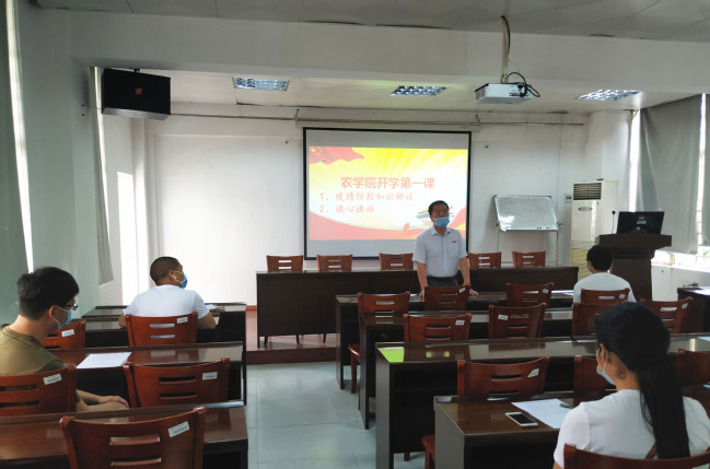 5月19日上午,农学院党委书记童庆满、副书记郑龙章和博士生辅导员吴家铭在学院三楼多媒体教室组织了“复学第一课”,对第一批返校复学的学生进行了疫情防控知识解读和谈心谈话。两位书记强调,学校师生众多、人员密集,是疫情防控的关键和重中之重。在这特殊时期,首先要做好安全防护,听从学校的安排,才能保障自己和他人的身体健康,希望同学们不扎堆、不聚集、佩戴口罩、勤洗手,宿舍勤消毒、勤通风。吴家铭则就返校后的具体事宜进行了安排部署,要求大家听从指挥、积极配合,落细、落实学生返校后的操作指南,加强体温自测与互相监测。